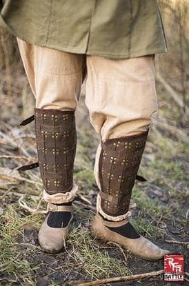 Protetor de tíbia de combate para reconstituições históricas. Disponível em castanho e tamanho S. Fabricado em pele natural de primeira qualidade. Costura nas bordas para reforçar a estabilidade estrutural e aumentar a vida útil. As cores são tingidas diretamente no material. Feito à mão por profissionais qualificados.