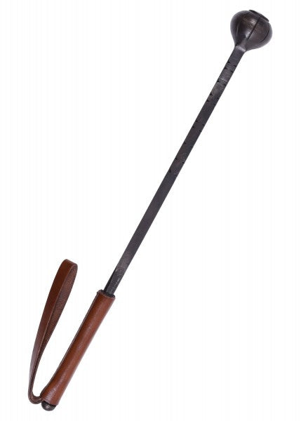 Esta maça simples e robusta, com cabo retangular e cabeça canelada em forma de bola ou bulbo, baseia-se em modelos históricos dos séculos XVI e XVII. Século inspirado. Foi forjado em aço carbono e está equipado com uma alça de couro costurada e uma pulseira de couro.