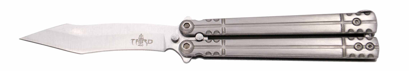 Terceira faca em leque K2820, lâmina de aço 420 de 7,2 cm, acabamento acetinado, cabo em aço inoxidável com acabamento acetinado. Referência K2820