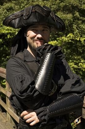 Protetor de antebraço de escudeiro em couro preto para reconstituições históricas. Feito de couro natural premium. Costura nas bordas para reforçar a estabilidade estrutural e aumentar a vida útil. As cores são tingidas diretamente no material. Feito à mão por profissionais qualificados. Os demais acessórios são vendidos separadamente.