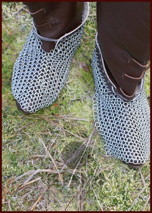 Par de pequenas polainas de cota de malha chamadas Escarpes ou Solleret que cobrem a parte traseira e as laterais do pé.