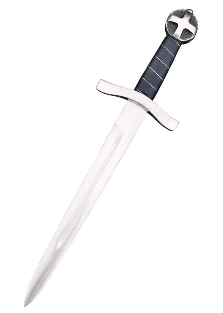 A lâmina da nossa réplica é forjada em aço de mola e se estende até o botão, onde é aparafusada de forma invisível . A alça é envolta em couro e arame trançado. A adaga tem uma guarda cruzada sólida e um punho redondo de ferro fundido forjável. A ponta da adaga não é afiada. A adaga tem um preenchimento profundo e bastante longo. Uma bainha de madeira revestida de couro com capa está incluída.