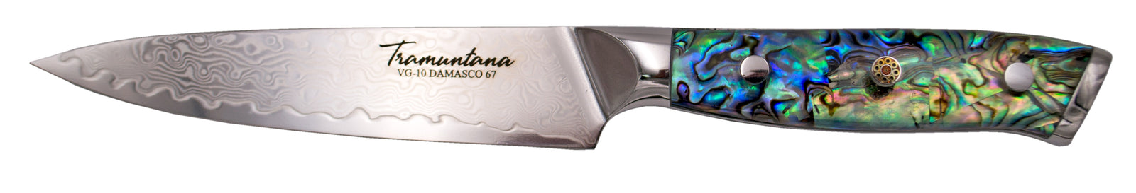 Faca de cozinha Tramuntana modelo CD12 Utility 12,5 cm Lâmina em aço Damasco VG10 de 67 camadas, cabo abalone com epóxi, com caixa de apresentação. Importar item. Referência CD12