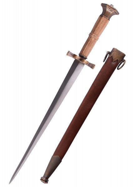 A bela arma perfurante que oferecemos aqui é baseada em uma peça original do início do século 16 (aproximadamente 1510-1540) agora na coleção do Metropolitan Museum of Art ( The Met ) localizado na cidade de Nova York. A lâmina é feita de aço mola EN45, tem uma seção transversal em forma de diamante e afunila em uma ponta afiada. As arestas de corte não são afiadas e a espiga é aparafusada na extremidade do cabo (porca roscada). A proteção e o botão, ambos trabalhados artisticamente, são feitos de latão com acabamento antigo e o cabo é esculpido em madeira. A proteção, que se alarga ligeiramente em ambos os lados na extremidade, é equipada com um anel lateral em forma de B e o botão hexagonal termina na parte superior e termina com uma tampa plana e lindamente decorada.