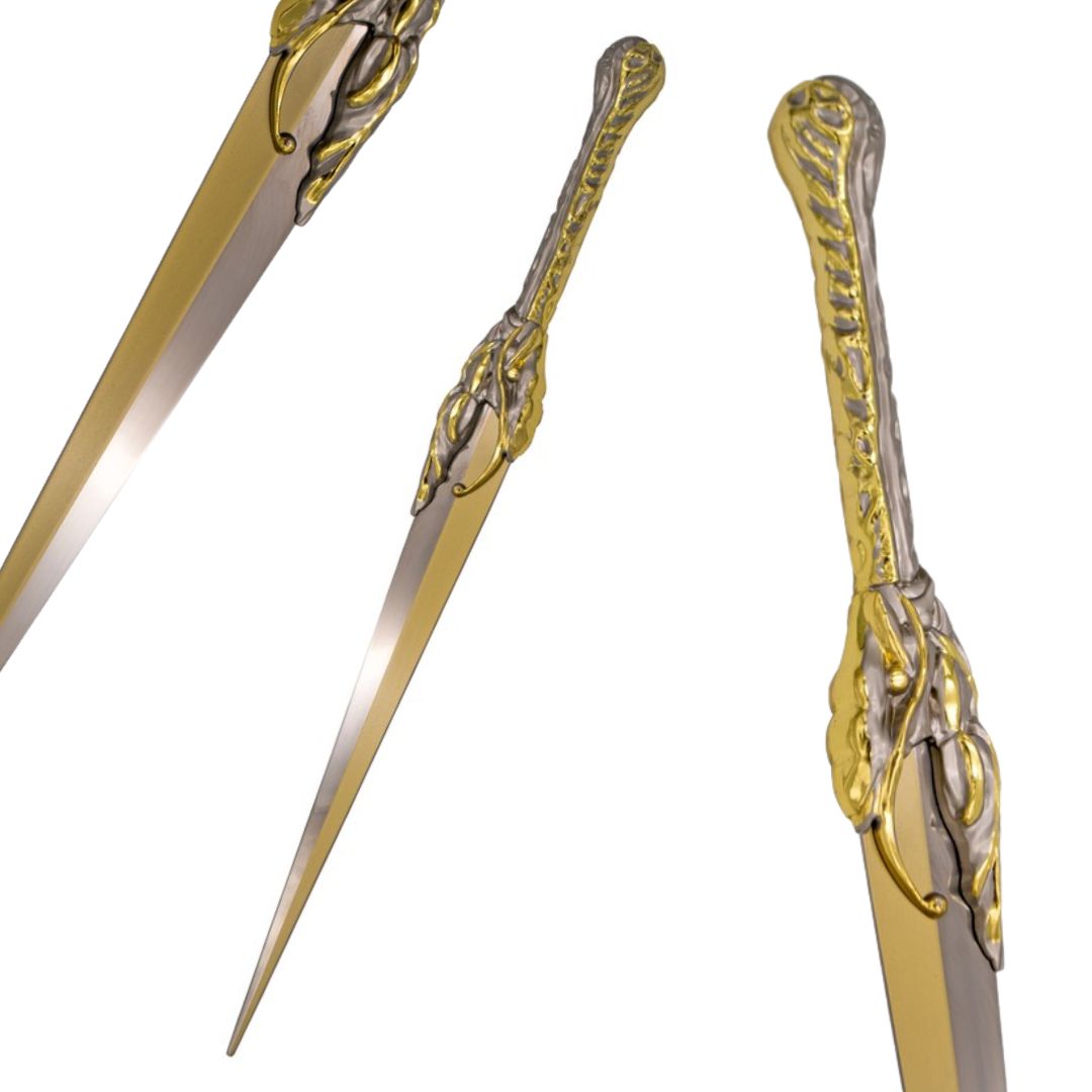 Design fiel à série: Cada detalhe desta adaga foi cuidadosamente projetado para capturar a essência da série "Rings of Power". Desde as intrincadas gravuras na lâmina até a elegante guarda e punho, esta adaga é uma representação precisa da magnífica arma de Galadriel.