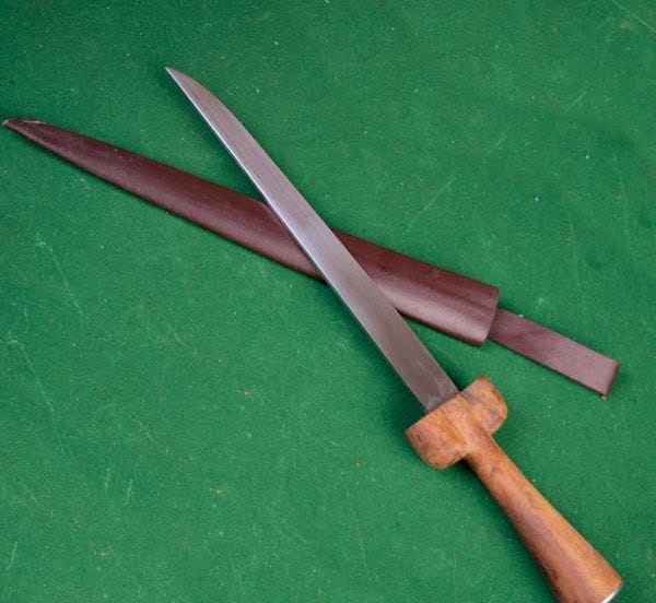 Adaga testicular dos séculos XIV e XV com bainha de couro e cabo de madeira.