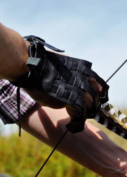Esta luva de tiro impressiona pela sua ajustabilidade. Cabe na mão. Fecha com fivela tradicional. O ajuste é feito puxando as tiras de couro na direção desejada.