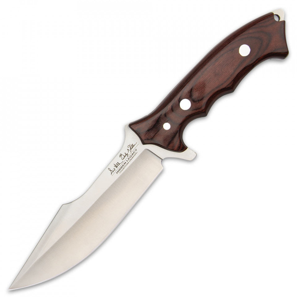 O cabo do Hibben Legacy Fighter IV é feito de madeira Pakka marrom com ranhuras para os dedos que proporcionam uma pegada confortável e segura. As escalas do cabo são fixadas à espiga completa com grandes pinos de aço inoxidável, garantindo que o cabo da faca seja forte e durável.
