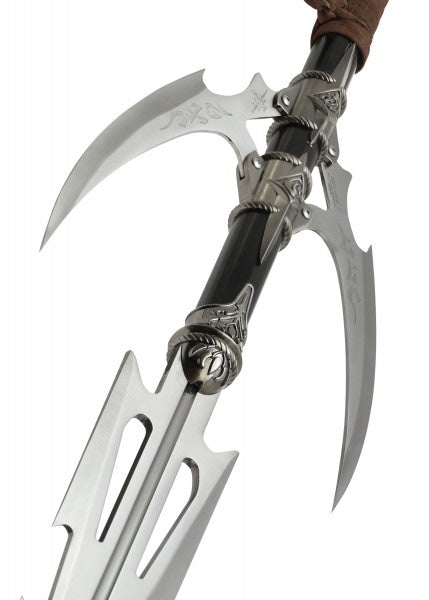 Detalhes: - Material: lâmina em aço inox 420, cabo em aço, enrolamento em couro e acessórios em metal - Comprimento total: aprox. 176,5 cm - Certificado de autenticidade