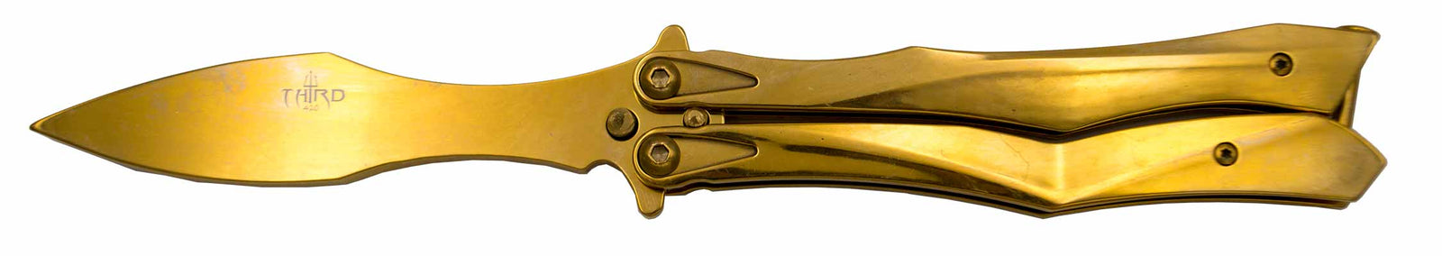 Terceira faca de prática K2818D, lâmina de aço 420 cega de 10,5 cm, banhada a titânio dourado, espessura da lâmina de 3,5 mm, cabo de aço inoxidável banhado a titânio dourado. Referência K2818DX