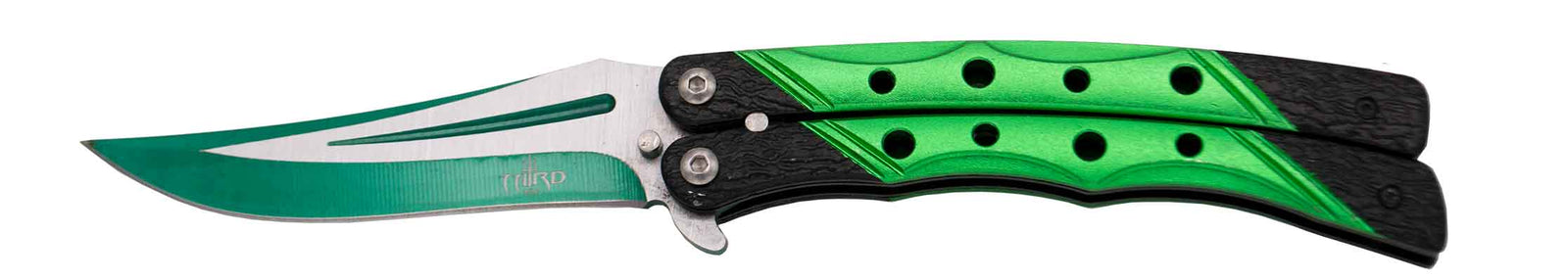 Terceira faca leque K2807GN, lâmina em aço 420 com acabamento acetinado e lâmina anodizada verde de 12,3 cm, cabo em alumínio preto e verde com furos. Referência K2807GN