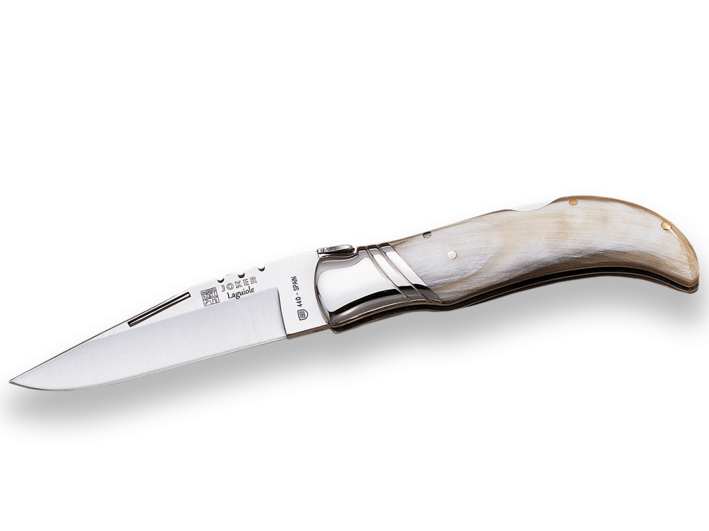Faca de caça Laguiole com virola de aço inoxidável. Punho de chifre de touro e lâmina de 9,5 cm. NA10