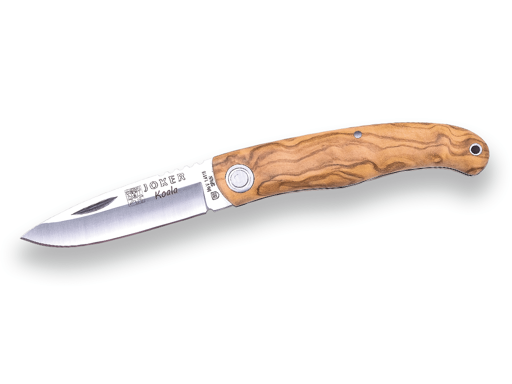 FACA ESPORTIVA JOKER KOALA, AÇO MOVA 1.4116, ESCALAS DE OLIVEIRA, LÂMINA 7 CM, PISTÃO.