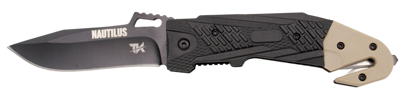 Faca Tática Tramuntana modelo NAUTILUS N79N Lâmina de aço 420 com acabamento preto de 9,2 cm, cabo de fibra de nylon com G10 marrom, com quebra-vidros e cortador de cinto com lâmina dupla, com caixa de apresentação, com clipe. Importar item. Referência N79N