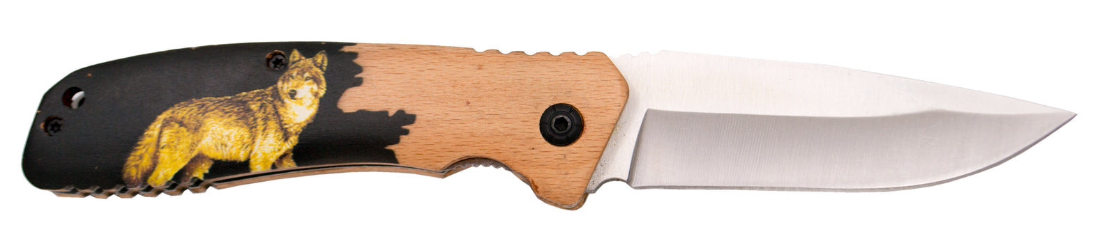 Terceira faca N65L, cabo em madeira de faia com estampa de lobo nas duas faces em preto e amarelo, lâmina de aço 420 com acabamento acetinado de 8,5 cm, faca com trava de forro. Referência N65L
