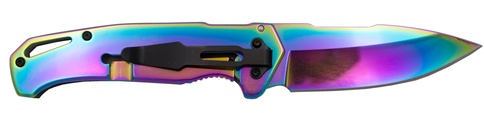 Terceiro canivete N70W, cabo de aço com impressão de caveira 3D de um lado, o outro é banhado em titânio arco-íris brilhante, lâmina de aço 420 de 8,5 cm banhada em titânio arco-íris brilhante. Com clipe. Referência N70W