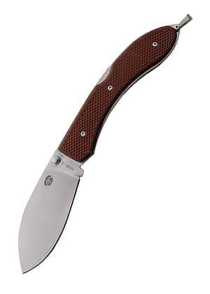 As peças do cabo de couro são ranhuradas e os pinos presos à lâmina facilitam a abertura com uma mão.