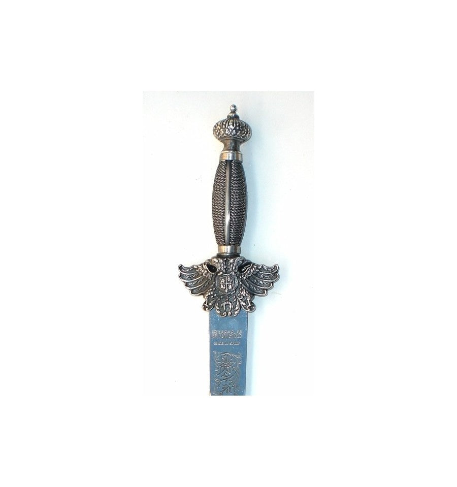 Adaga de águia rústica gravada, em latão ou prata, com lâmina em aço inoxidável. Comprimento 49 cm, peso 600 gramas. É feito em Toledo por isso é de primeira qualidade