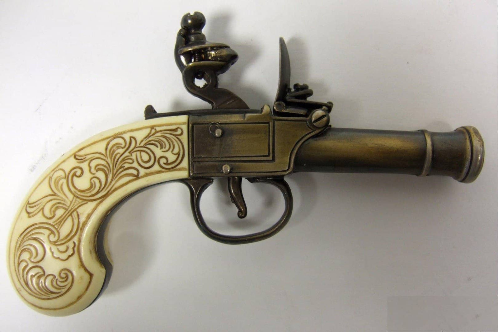 Réplica impressionante de uma pistola de pederneira fabricada por Bunney, Inglaterra, século XVIII.