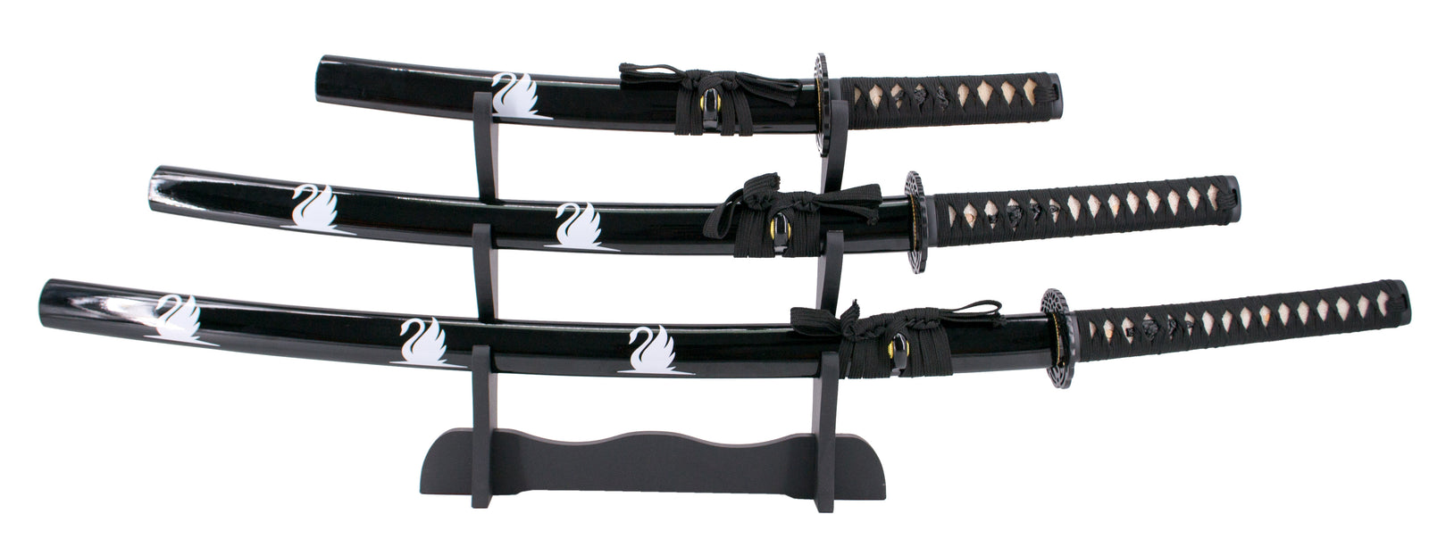 - Bainha laqueada: preta brilhante decorada com três cisnes brancos.