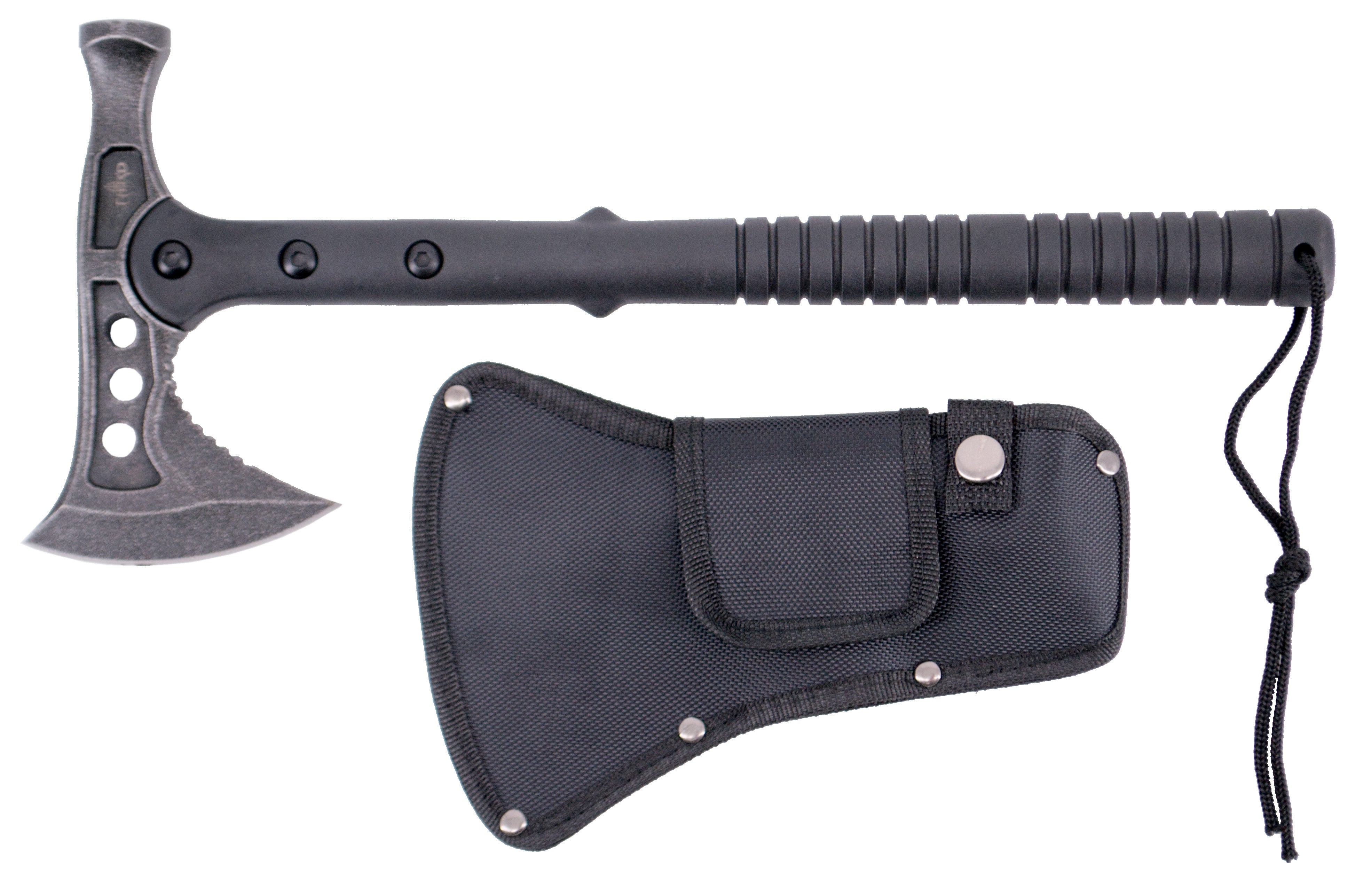O robusto terceiro machado M9001N com acabamento em pedra escura é o complemento perfeito para seu equipamento ou coleção de aventura. Qualidade e durabilidade em 38 cm de aço. M9001N