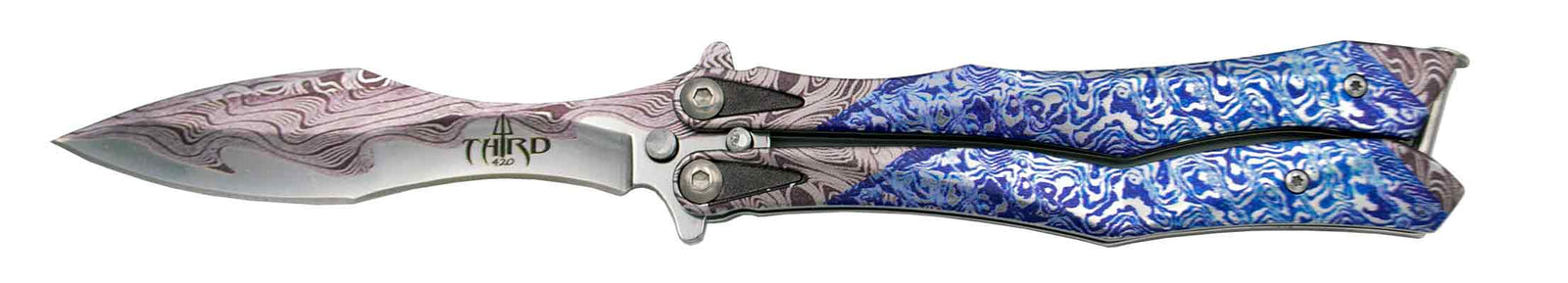 Terceira faca em leque K2818DC, lâmina de aço 420 cega de 10,5 cm, espessura da lâmina de 3,5 mm com primer de imitação de damasco 3D, cabo de aço inoxidável banhado com primer de imitação de damasco 3D. Referência K2818DC
