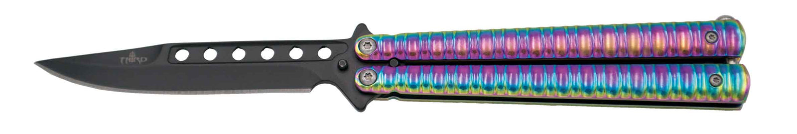 Terceira faca em leque 16071N Lâmina em aço inoxidável preto de 11,5 cm com furos, cabo em aço inoxidável com efeito onda banhado em titânio arco-íris brilhante. Ref. 16071N