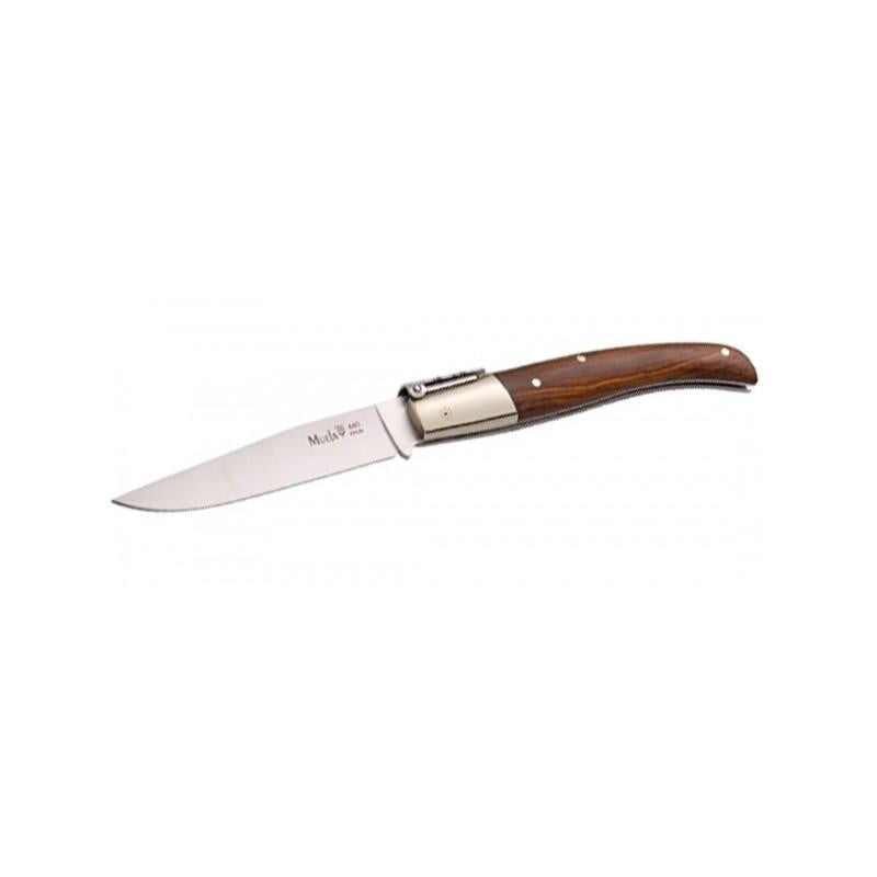 Impressionante faca da prestigiada empresa Muela. É uma faca com lâmina de aço 60 molbdênio vanádio de alta qualidade e dureza 57-58 HRC, com cabos de madeira prensada coral.