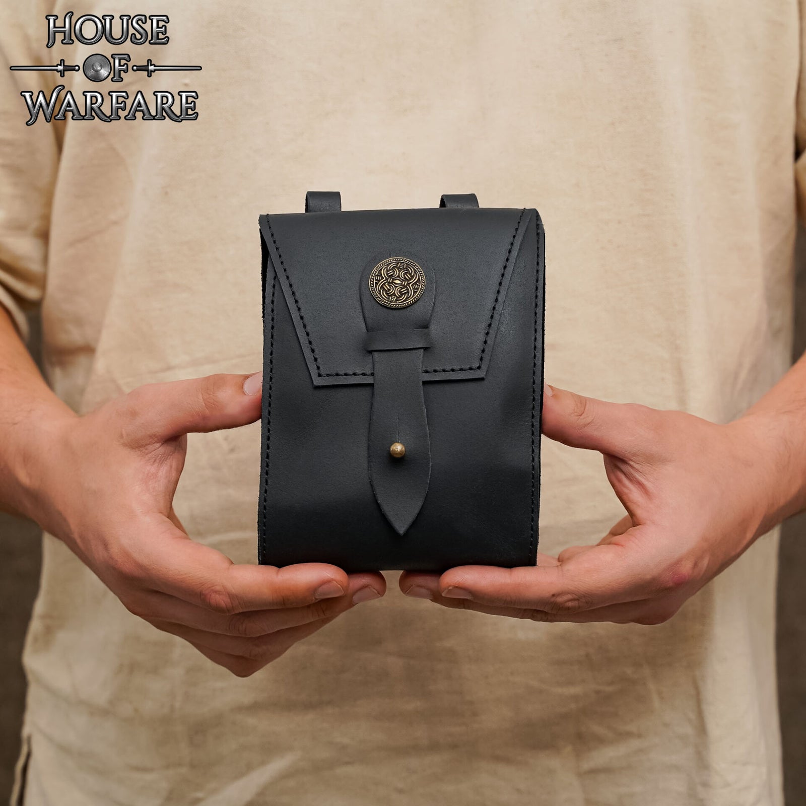 Fabricada em pele genuína espessa, a bolsa apresenta um detalhe de arredondamento em relevo e uma aba pontiaguda que combina perfeitamente com qualquer traje de LARP, viking ou renascentista. O interior espaçoso acomoda confortavelmente pequenos artigos essenciais — moedas, dados, relíquias ou até um telemóvel compacto — enquanto duas presilhas de cinto rebitadas fixam a bolsa a qualquer cinto até 8,9 cm de largura.
