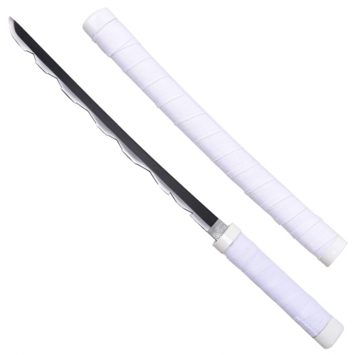 Esta mini katana de Inosuke Hashibira tem um excelente acabamento. Possui lâmina de aço serrilhada e cabo com fio branco, feito para oferecer uma pegada segura e confortável. Além disso, sua bainha é feita com corda branca, o que lhe confere um toque muito autêntico.